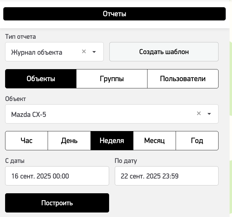 Для построения отчета необходимо указать объект или группу объектов по которым он необходим, временной интервал.