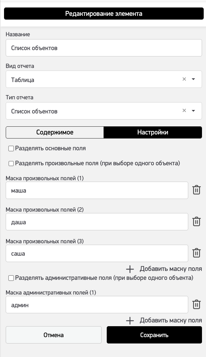 Так же отчет выведет все Административные поля с выбранной для них маской.