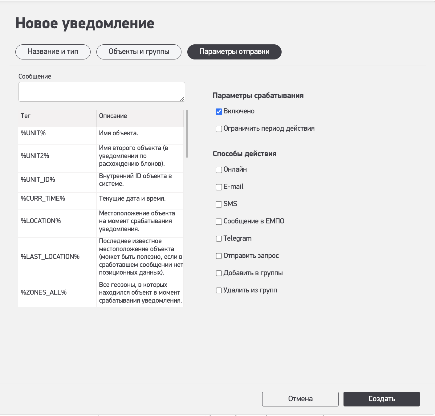 - %LOCATION%-естоположение объекта на момент срабатывания уведомления