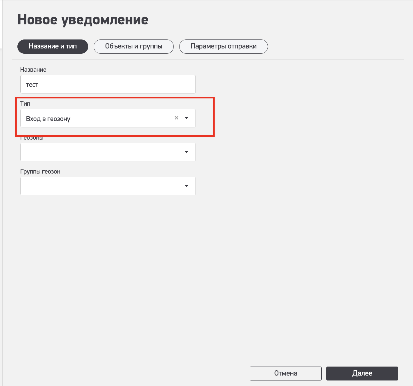 При создании уведомления, помимо указанного ранее, необходимо указать Тип уведомления - Вход в геозону Геозоны по которым уведомление будет отслеживать вход: