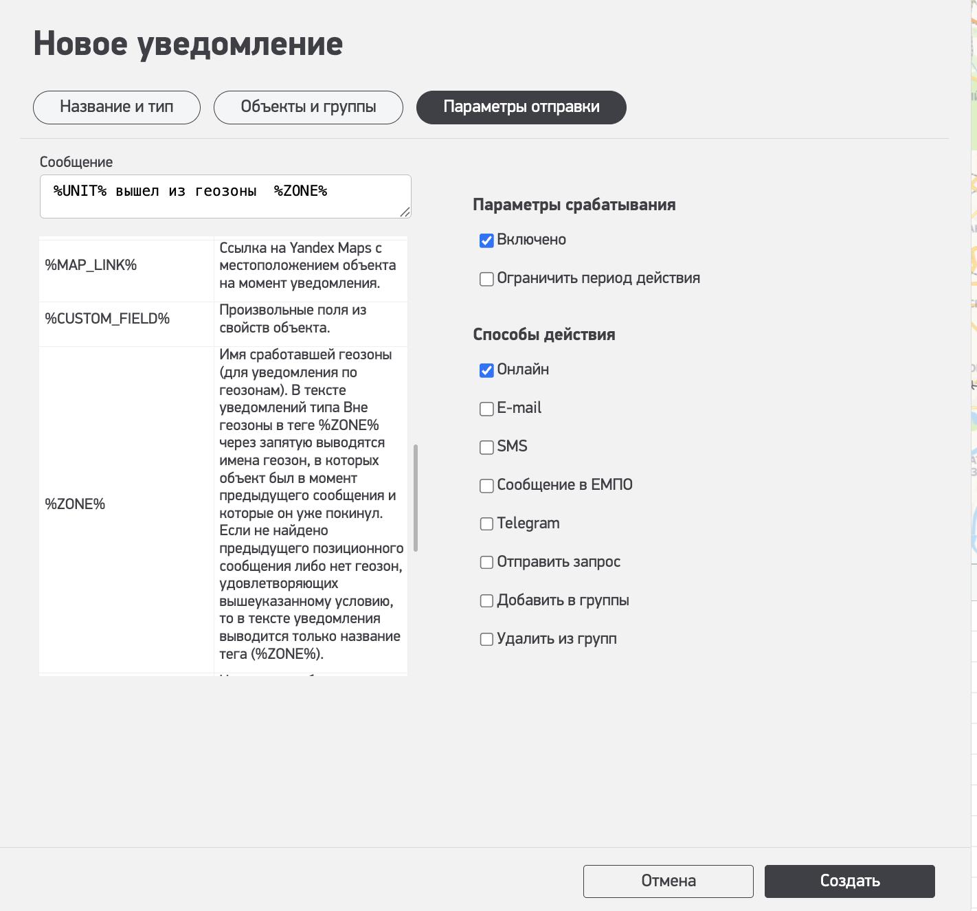 Если необходимо уведомление по выходу из геозоны, соответственно необходимо в Типе уведомления указать - Выход из геозоны и так же указать необходимую геозону: