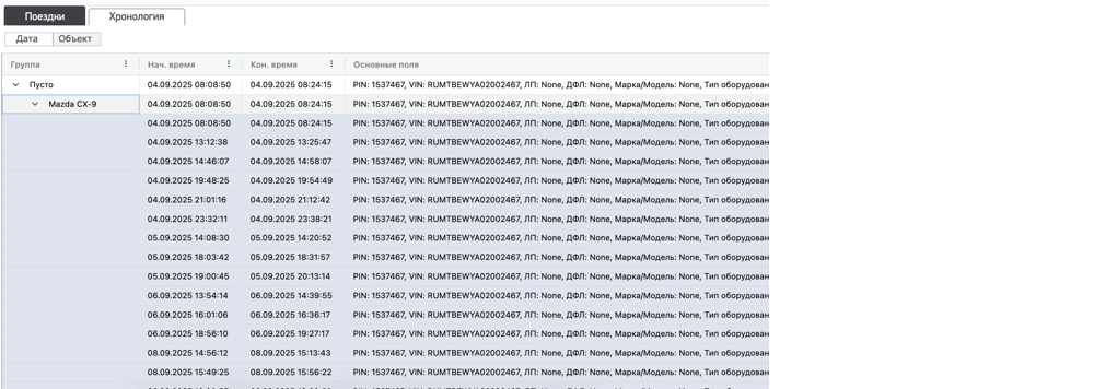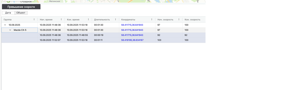 2. Добавили группировку по объекту и дате в отчет превышения скорости: