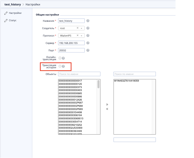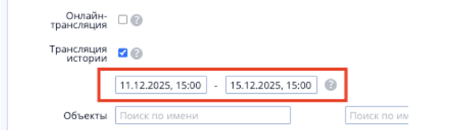 Для включения ретрансляции истории необходима проставить галочку в чекбокс Трансляция истории: