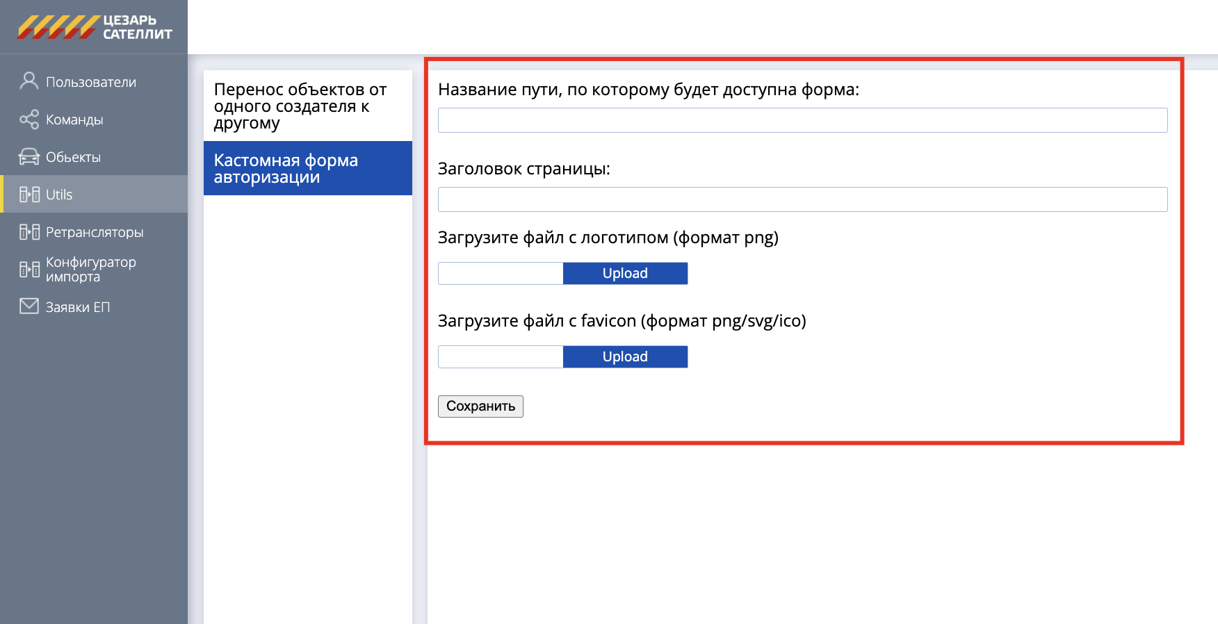 Для создания кастомной формы авторизации в панели администратора необходимо зайти во вкладку Units, далее во вклалку Кастомная форма авторизации: